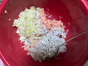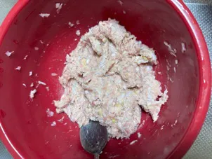 ②ボウルにしらす、鶏ひき肉、①を加え混ぜ合わせる。