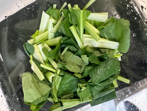 ①小松菜のナムルを作っていく。小松菜は3㎝幅に切る。