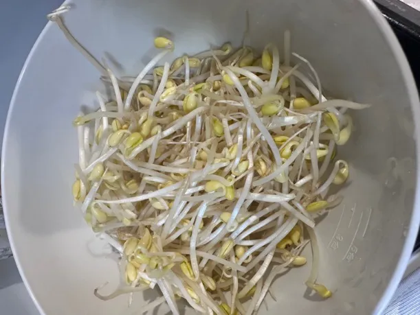 ③もやしのナムルを作っていく。耐熱容器に移しラップをし、レンジ500wで3分加熱したら、水気を切って鶏がらスープ顆粒とごま油と炒りごまを混ぜる。