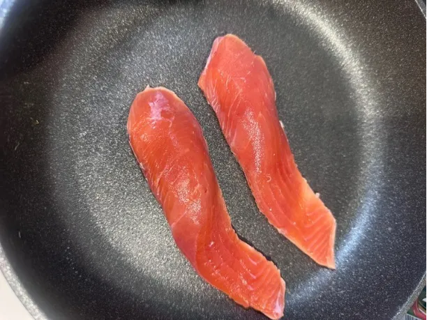 ④フライパンを熱し、鮭を中火で両面焼き目をつけながら、火が通るまで焼く。