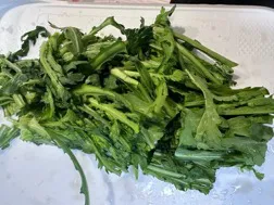 ⑥春菊を茎から加えていき、2~3分ほど煮込む。