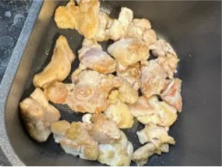 ④鍋にオリーブオイルをひき中火で鶏肉を焼き色がつくように両面焼く。