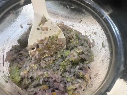 ④炊けたらブロッコリーを崩しながら混ぜ込み、10分ほど蒸らす。