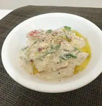 ⑥ 皿に盛り、オリーブオイル(分量外)、ブラックペッパーをかけて完成。