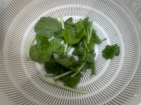 ②ルッコラは洗ってよく水を切り、食べやすい大きさにちぎる。